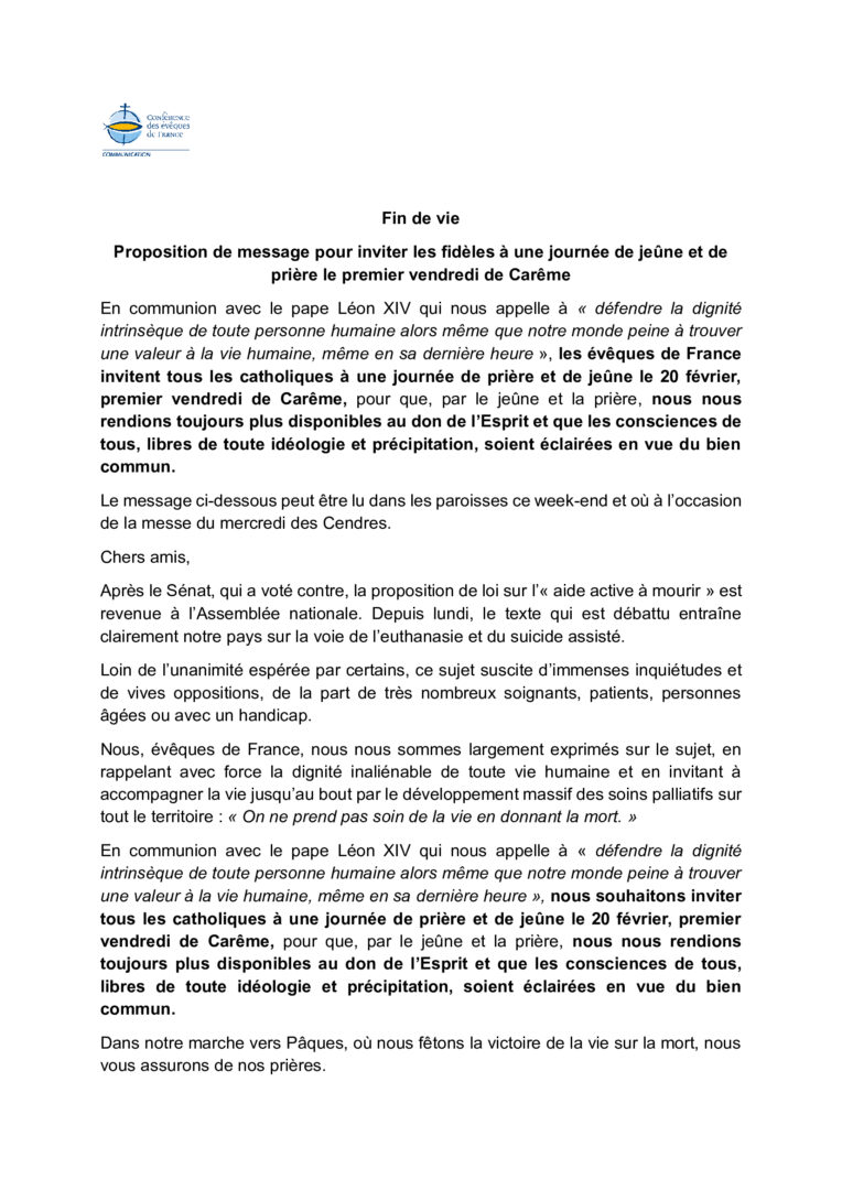 Alors que ce projet de loi suscite de vives inquiétudes chez de nombreux soignants et personnes vulnérables , nous sommes appelés à affirmer la dignité inaliénable de toute vie humaine jusqu’à son terme. Le vendredi 20 février, premier vendredi de Carême, rejoignons cette journée nationale de prière et de jeûne pour éclairer les consciences en vue du bien commun.