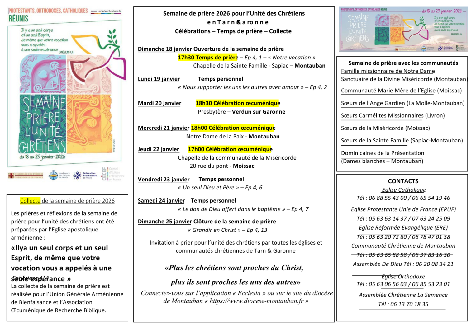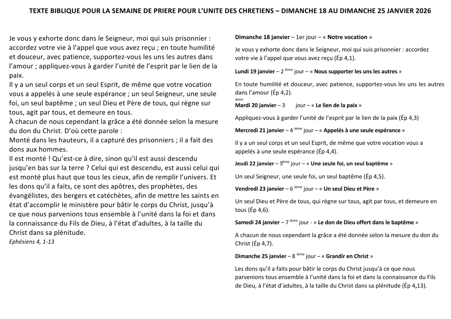 L’exhortation de l’apôtre Paul résonne particulièrement en cette année : « Il y a un seul corps et un seul Esprit, comme il y a une seule espérance à laquelle vous avez été appelés » (Ep 4,4). Ce verset, retenu pour 2026, éclaire avec profondeur le sens et l’enjeu de la démarche vers l’unité des chrétiens.