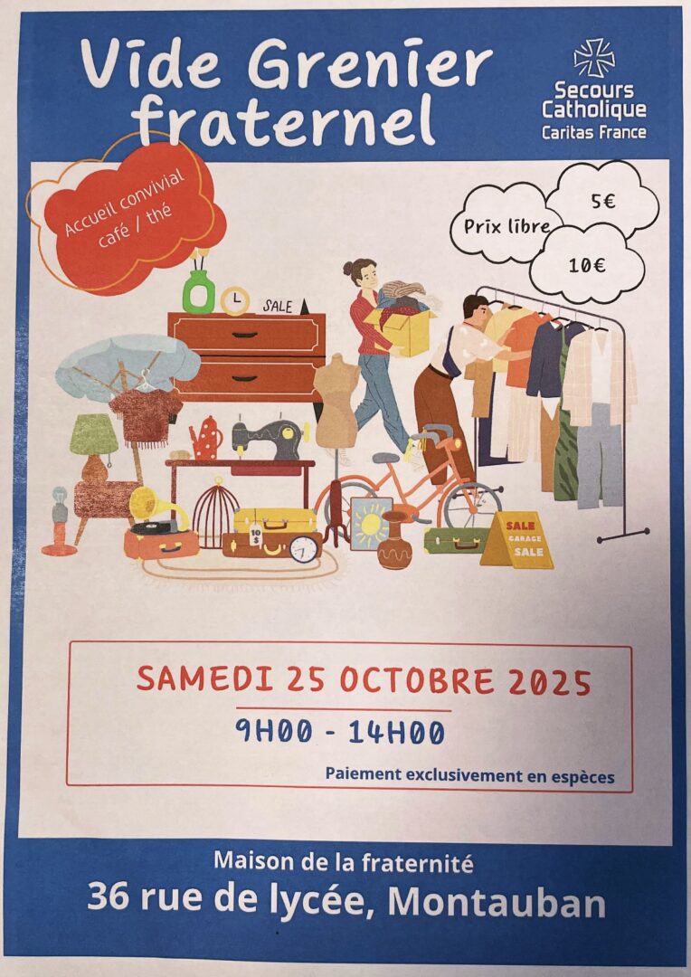 Diocèse de Montauban 25 octobre 2025 09h00 Maison de la fraternité Vide grenier fraternel du Secours Catholique En savoir plus